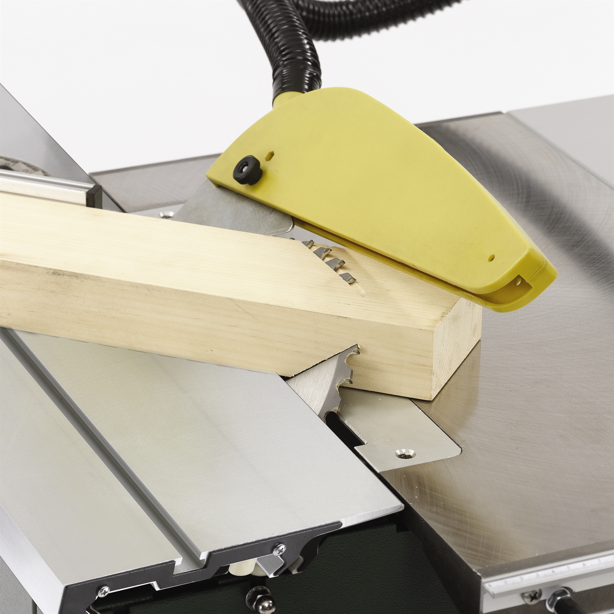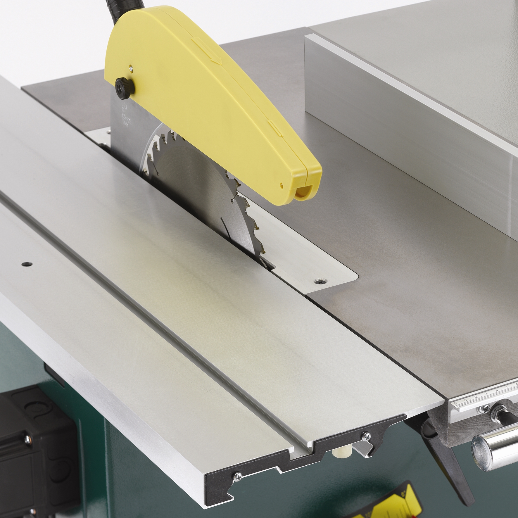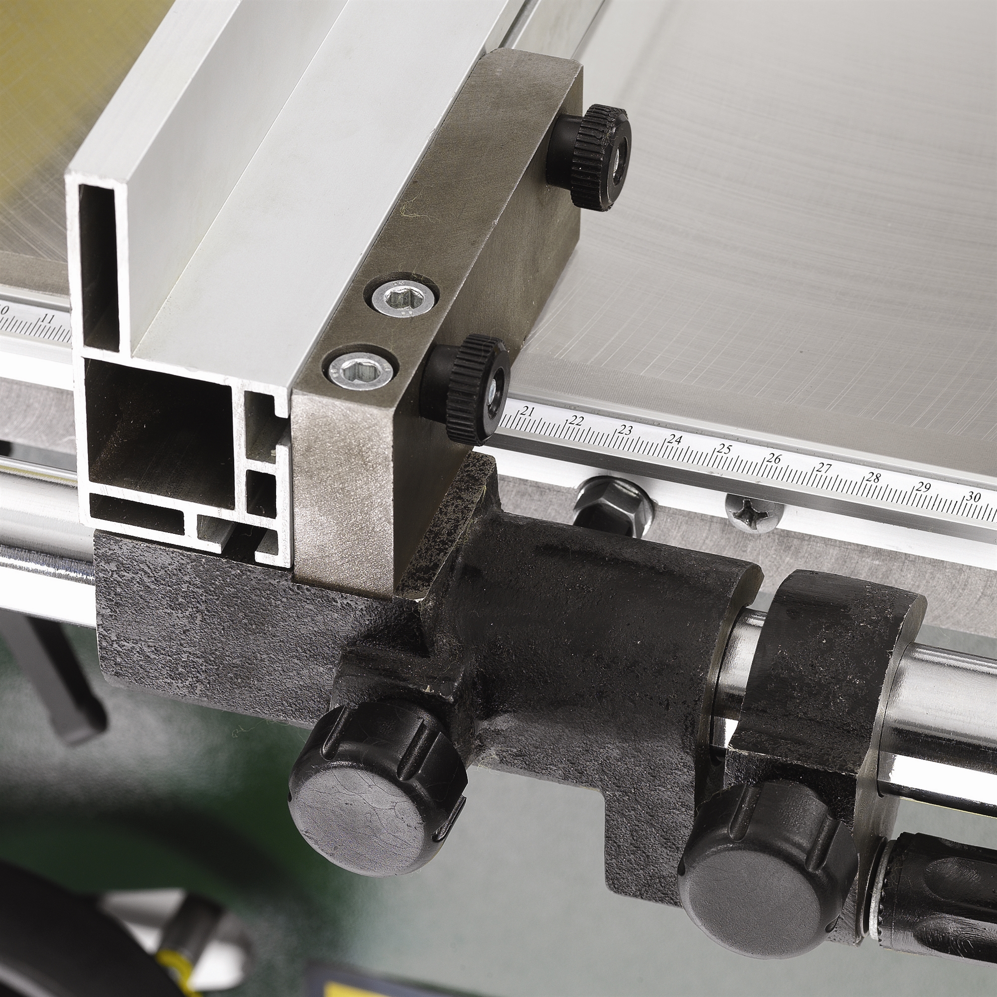 Parallellanslaget är stabilt och består av en kraftig aluminiumprofil monterad på ett gjutjärnsfäste med finjustering. Det hela är monterat på en solid stålskena som ger maximal stabilitet och precision.