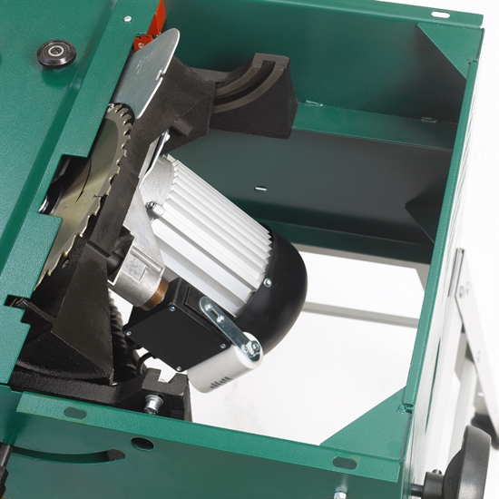 Klingan drivs av en kraftfull 2 hk (1,5 kW) induktionsmotor med remdrift, vilket ger en jämn, tyst och driftsäker gång. Maskinen är anpassad för 230V, vilket gör den enkel att ansluta i vanliga eluttag. Sågenheten är tillverkad i gjutjärn och monterad på den svetsade stålramen med två stora gjutjärnstrissor som är noggrant bearbetade för att ge en smidig och exakt justering. Höjd- och vinklingsjustering sker via separata handtag med kugghjulsdrivning.