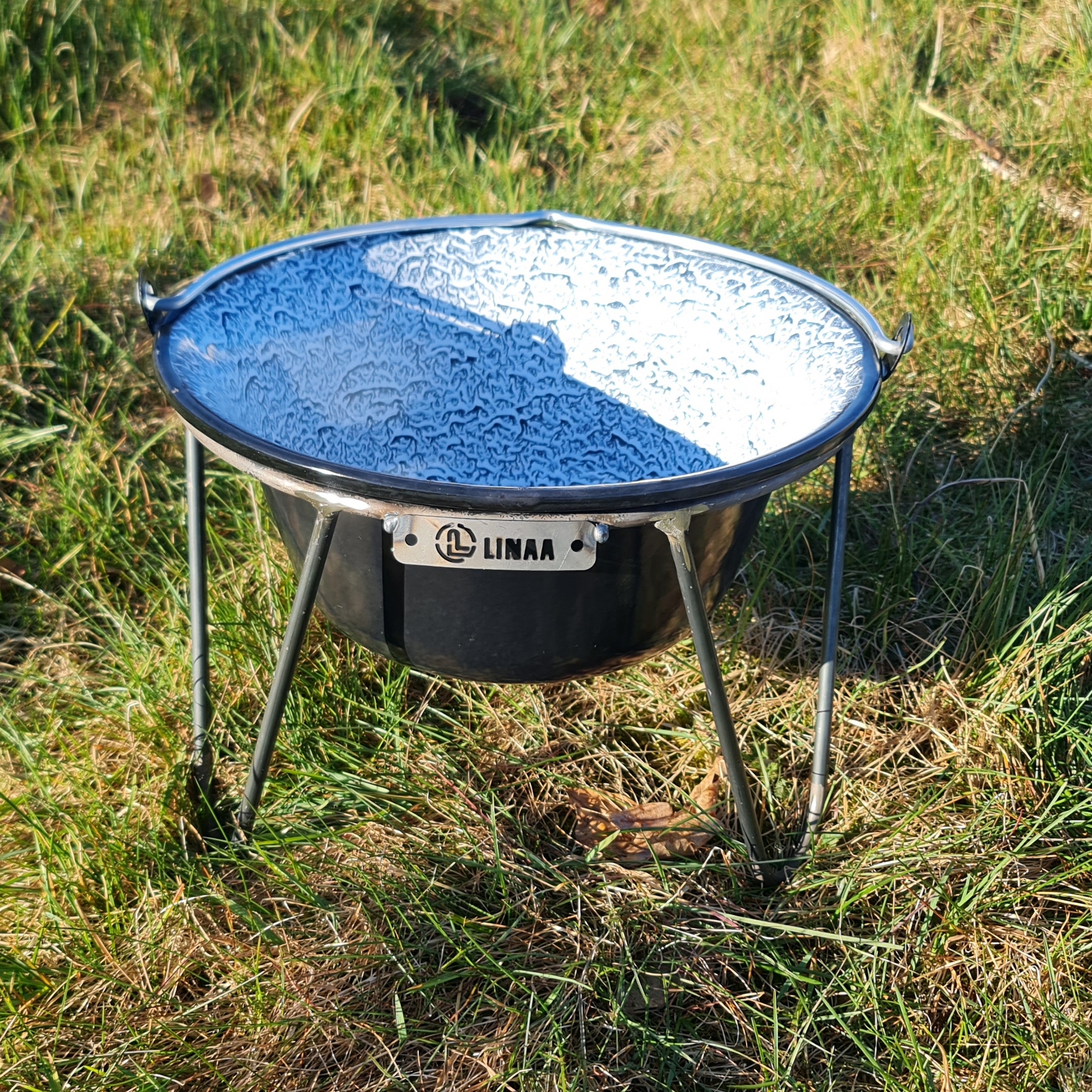 Gryta med blå emalj inredning och svart emalj exteriör vid matlagning över öppen eld.