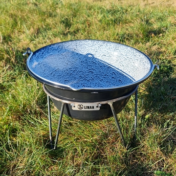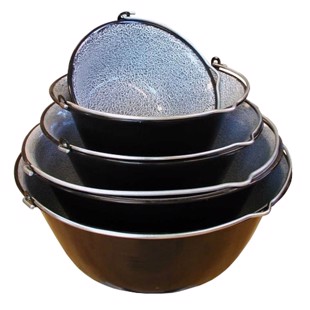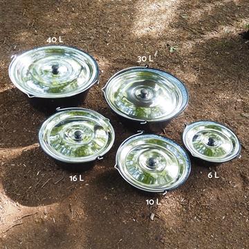 Tänk dock på att emaljgrytor är känsliga för slag och stötar. De får inte placeras direkt i glöden, eftersom värmen då blir för hög. Använd istället ett stativ för upphängning, en trefot eller ett eldkök så att det finns avstånd till värmekällan. Vi erbjuder både stora och små emaljgrytor. De större modellerna är särskilt lämpliga för skolor, föreningar och andra sammanhang där det lagas mat eller dryck till många personer.