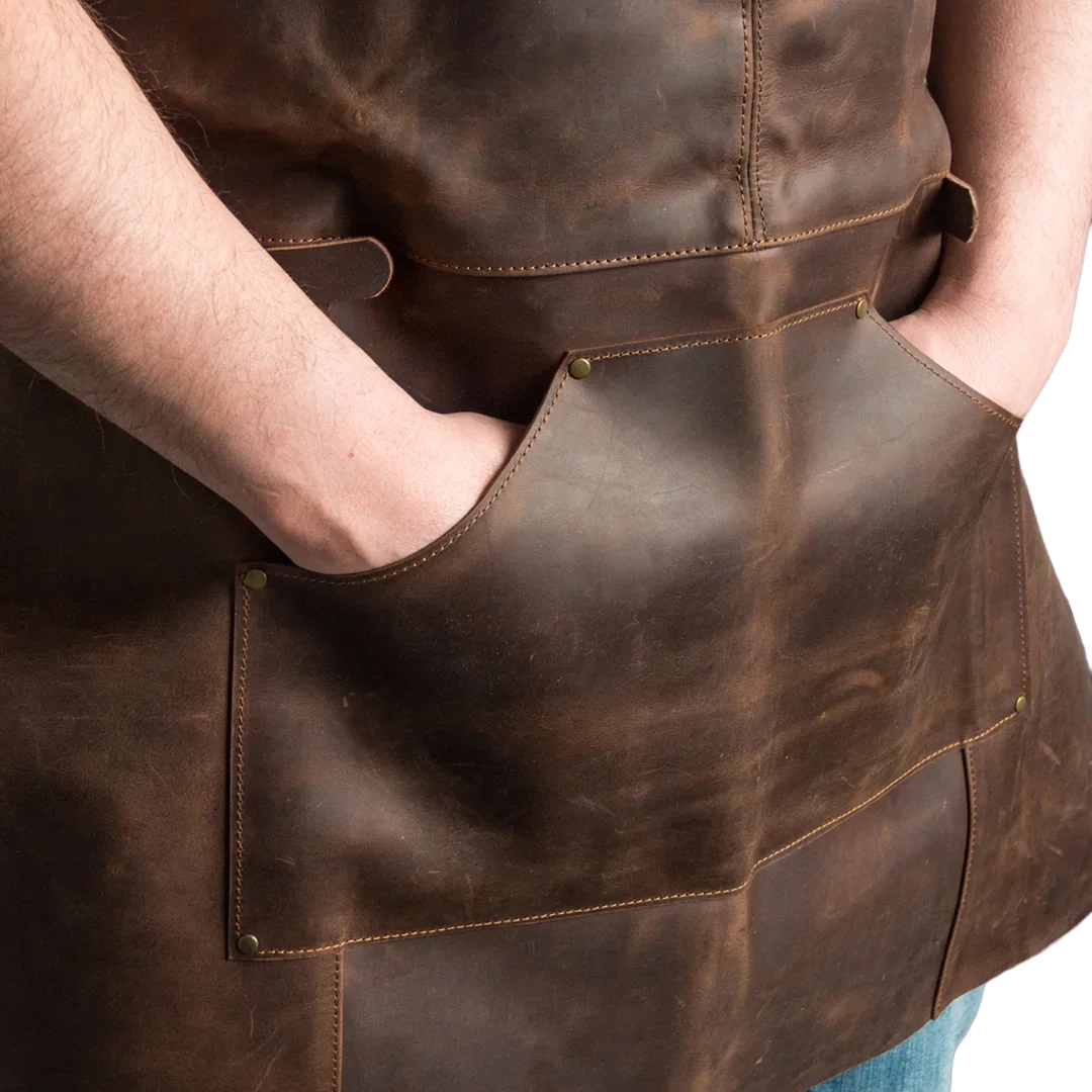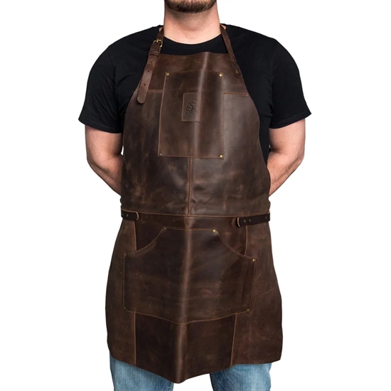 Förklädet är en allt-i-ett-lösning för både professionella och hobbyutövare: träarbetare, snickare, mekaniker, tekniker, DIY-entusiaster, barberare, kockar, grillälskare, baristor och konstnärer får alla nytta av det funktionella och stilrena designen. Det är tillverkat av kraftigt äkta brunt läder och dekorerat med metallnitar, öljetter och justeringsmöjligheter för både hållbarhet och stil.