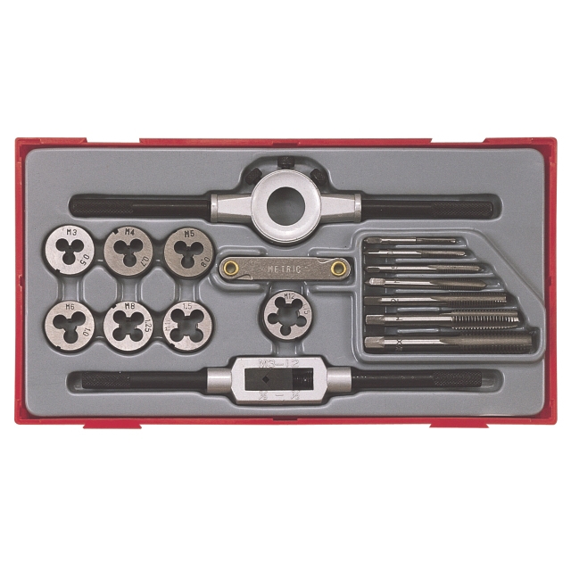 Tengtool, 17 delar 3-12 mm Sats med 17 delar innehållande en gängtapp och ett gängsnitt av varje dimension samt ett svängjärn, en gängkloppa och en gängmätare. Levereras i facklåda av plast med avtagbart lock.