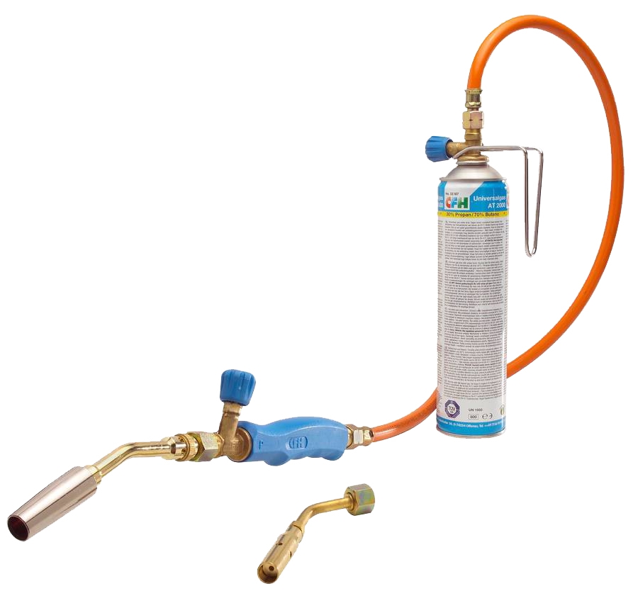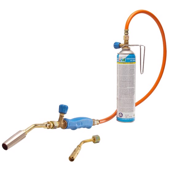 Utrustad med en kraftfull turbo-brännare på Ø20 mm och en speciell lödbrännare på Ø14 mm för fläcklödning. Kan anslutas till den medföljande 330 g gasflaskan samt till alla vanliga propan-butangasflaskor.