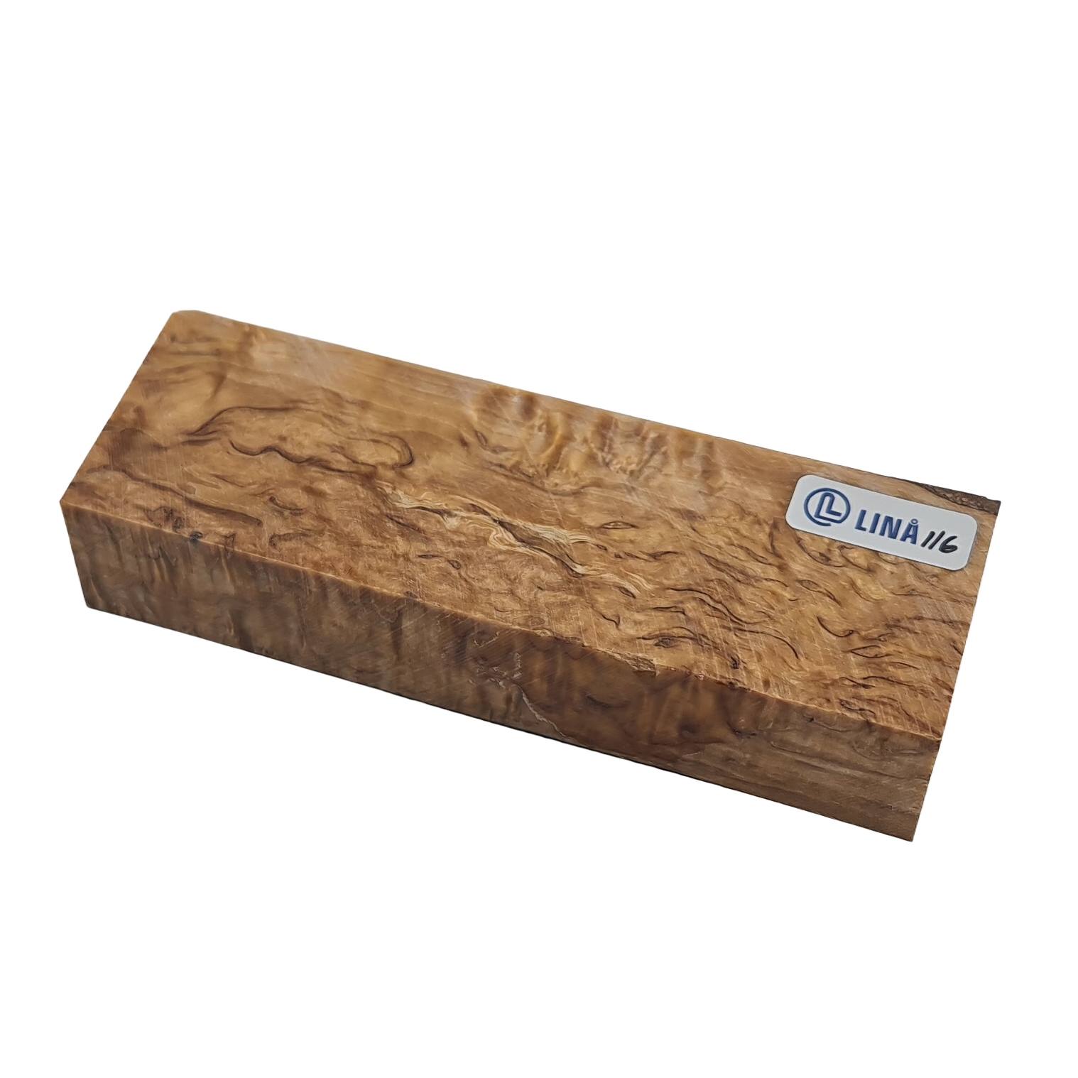 Detta träemne är framställt av noggrant utvald masurbjörk, som är känd för sin livliga och karaktärsfulla ådring med små knutor, vågor och ett tydligt spel i ytan. Den naturliga strukturen ger ett dynamiskt och dekorativt uttryck där varje emne är helt unikt. Det gör materialet särskilt lämpligt för projekt där både estetik och hantverk står i fokus – exempelvis knivskaft, smycken eller mindre grepp.