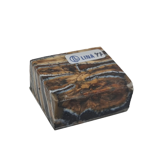 Mammut kindtand, även kallad mammut molar, stabiliserad av Raffir är ett särskilt material med både historia och karaktär. Tanden härstammar från den senaste istiden, uppskattningsvis 10 000 till 40 000 år tillbaka, och bär tydliga spår av sitt ursprung i struktur och färgspel. Genom stabilisering med resin har materialet gjorts användbart för modernt hantverk, där det annars fossila och porösa utgångsmaterialet får tillräcklig styrka och hållbarhet för praktisk användning.