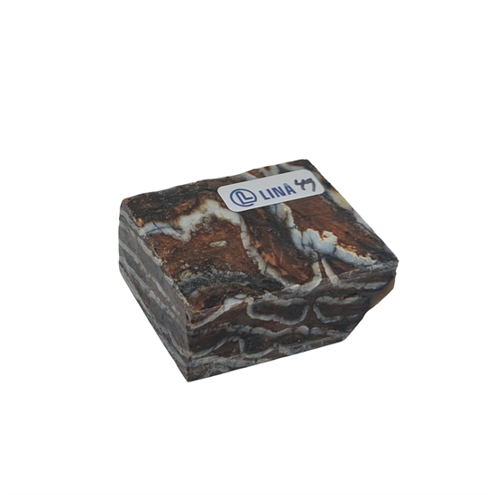 Mammut kindtand, även kallad mammut molar, stabiliserad av Raffir är ett särskilt material med både historia och karaktär. Tanden härstammar från den senaste istiden, uppskattningsvis 10 000 till 40 000 år tillbaka, och bär tydliga spår av sitt ursprung i struktur och färgspel. Genom stabilisering med resin har materialet gjorts användbart för modernt hantverk, där det annars fossila och porösa utgångsmaterialet får tillräcklig styrka och hållbarhet för praktisk användning.