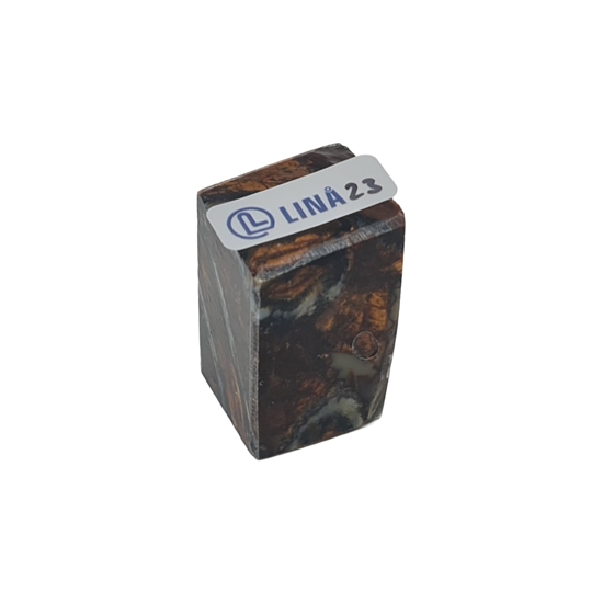 Mammut kindtand, även kallad mammut molar, stabiliserad av Raffir är ett särskilt material med både historia och karaktär. Tanden härstammar från den senaste istiden, uppskattningsvis 10 000 till 40 000 år tillbaka, och bär tydliga spår av sitt ursprung i struktur och färgspel. Genom stabilisering med resin har materialet gjorts användbart för modernt hantverk, där det annars fossila och porösa utgångsmaterialet får tillräcklig styrka och hållbarhet för praktisk användning.