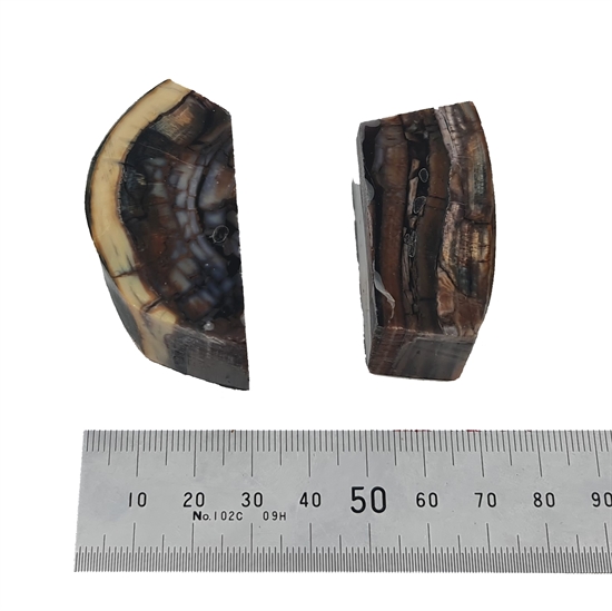 Detta set innehåller två matchande bitar av mammutbete, noggrant utvalda för både färg och mönster, vilket gör dem lämpliga som fram- och bakholk för knivskaft. Alternativt kan de användas individuellt till två separata knivar.