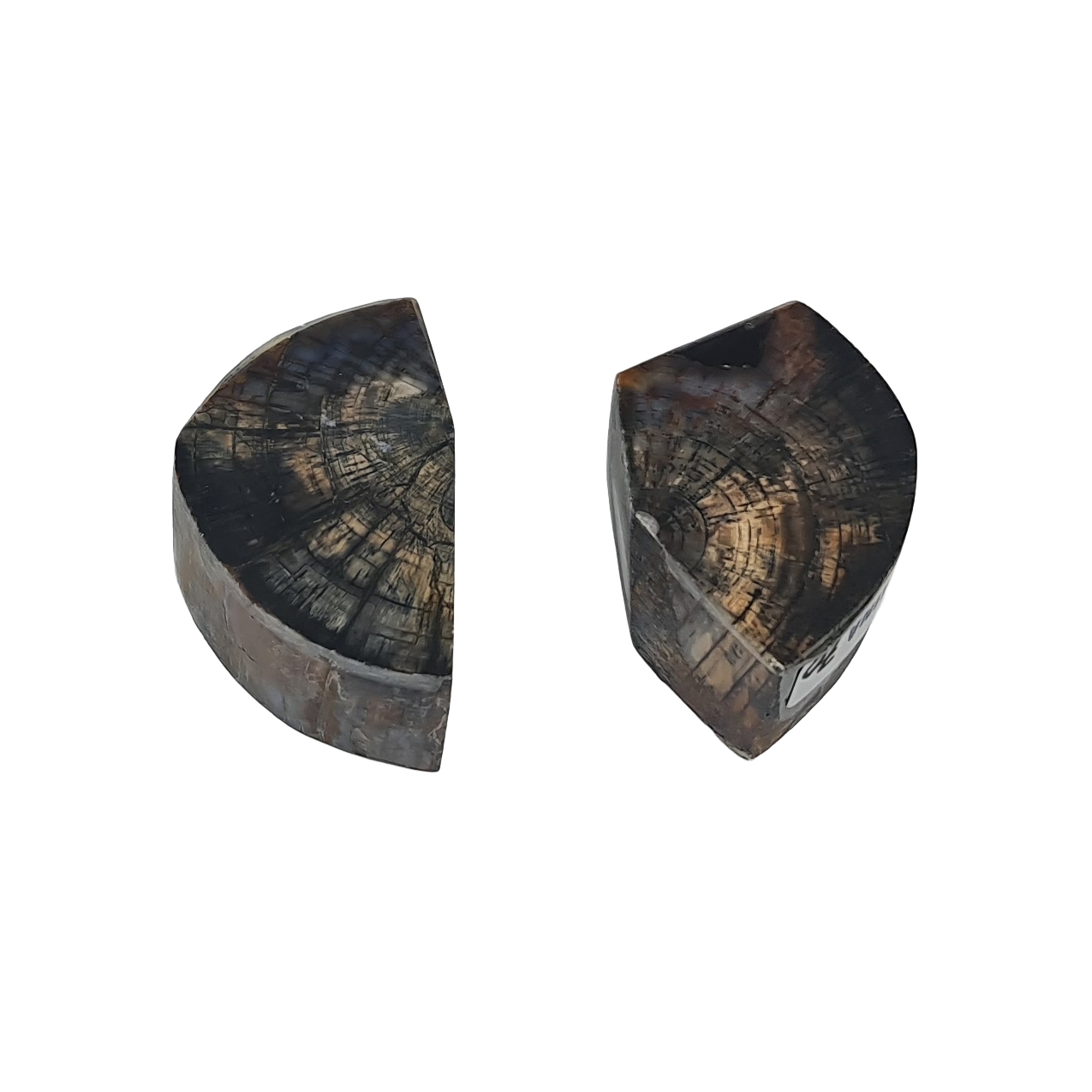 Detta set innehåller två matchande bitar av mammutbete, noggrant utvalda för både färg och mönster, vilket gör dem lämpliga som fram- och bakholk för knivskaft. Alternativt kan de användas individuellt till två separata knivar.