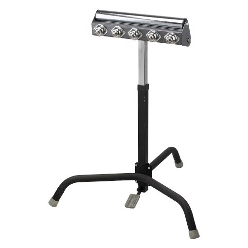 Luna. Kombinerat rull- och kulstöd till hyvlar, cirkelsågar och fräsmaskiner, med vridbart stödhuvud (ett läge med rulle, ett läge med kulbana). Låsning av inställt höjdläge med fotpedal.