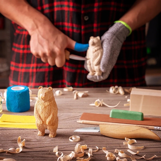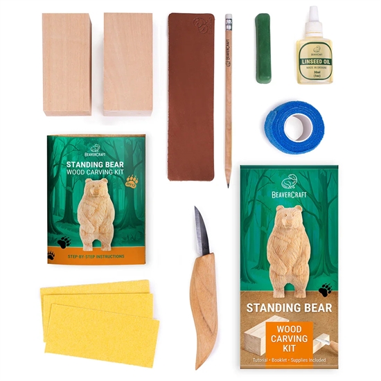 Kitet innehåller alla nödvändiga verktyg och material: en stor grovkniv för att forma träet, två basswood-block som är mjuka och lätta att snida, tre sandpapper för att släta ytan, samt en läderstropp med polerpasta för att hålla knivens egg vass. Skärskyddstejp ingår för säkerhet under snidningen, tillsammans med en blyertspenna för markering och skissering. Kitet innehåller även naturlig linolja – en perfekt finish som skyddar och framhäver träets ådring – samt en detaljerad steg-för-steg-handledning som guidar dig genom hela snideriprocessen.