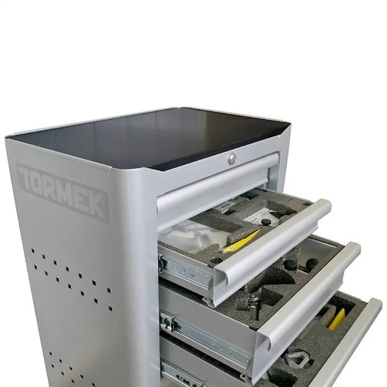 De specialanpassade lådorna är utformade för Tormeks egna inredningar och gör det enkelt att hålla ordning på jiggar, tillbehör och mätverktyg. Lådorna är förberedda för inredning till maskintillbehör, Hus & Hem-paketet samt svarvpaketet, vilket ger en strukturerad förvaring nära arbetsplatsen. De tre övriga lådorna levereras med gummimattor som skyddar innehållet och håller det på plats under användning.