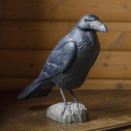 Omgiven av myter har råkan länge varit förknippad med ondska, död och ockultism. Dess rykte sträcker sig över nästan alla världens kulturer sedan århundraden tillbaka. Denna skickligt handskurna träfågel fångar råkans gåtfulla uttryck.
