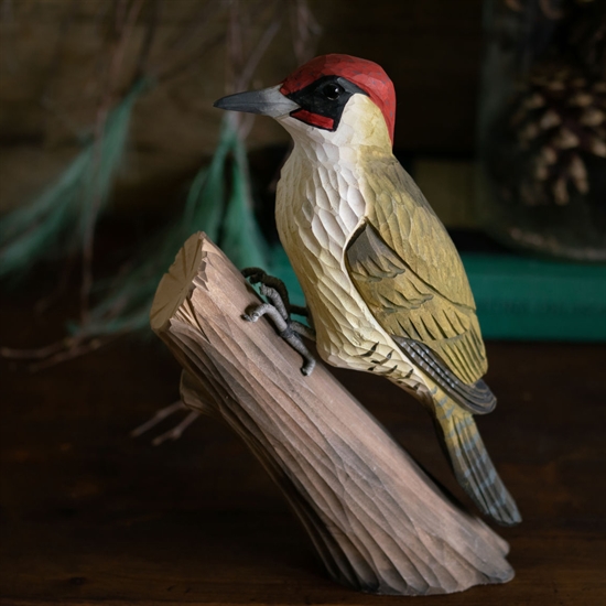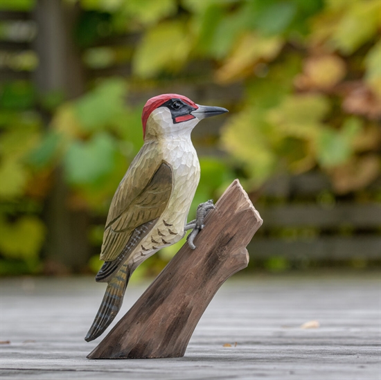 Grönspettaren är naturtrogen, handskuren och målad med vattenbaserad färg. Kan placeras både inomhus och utomhus.