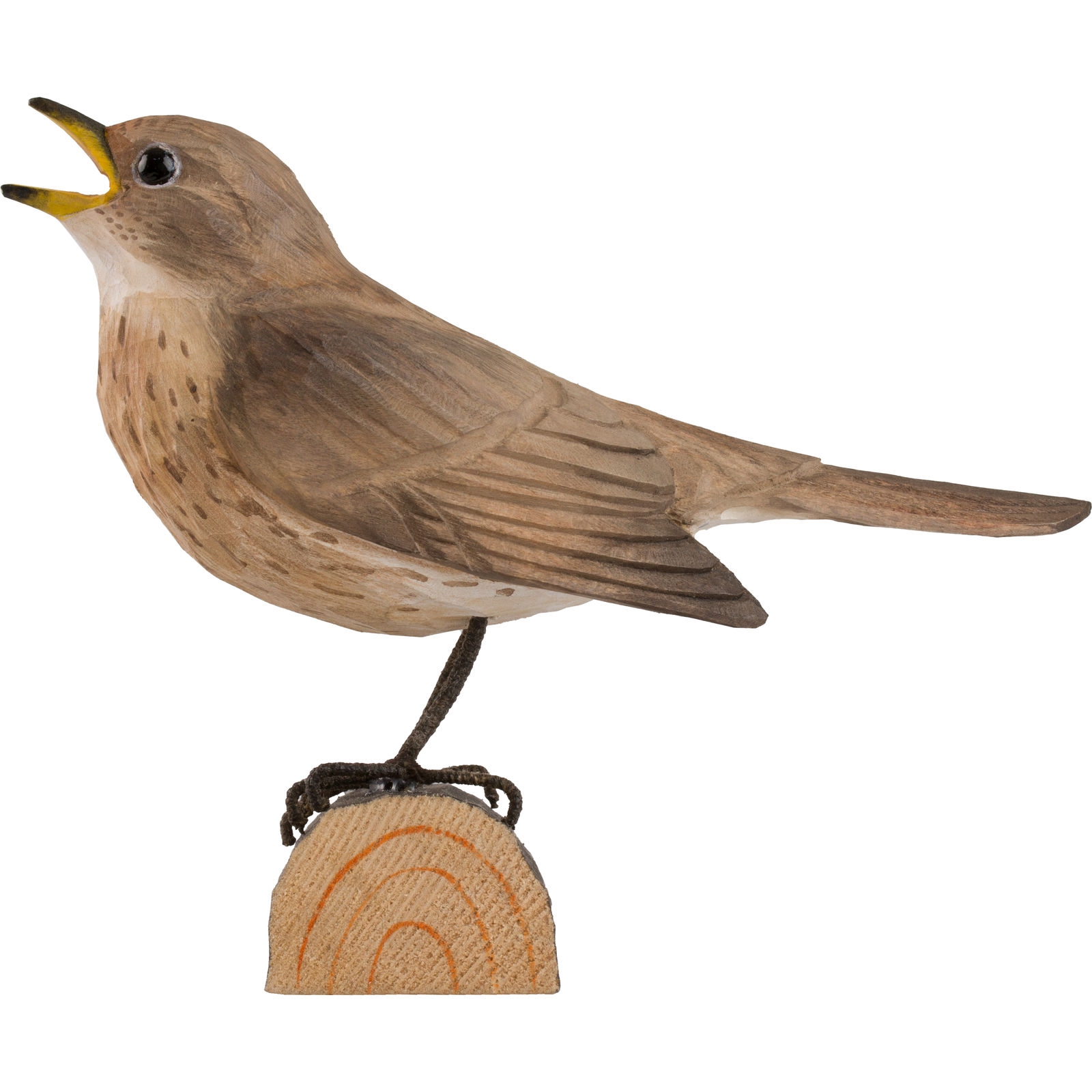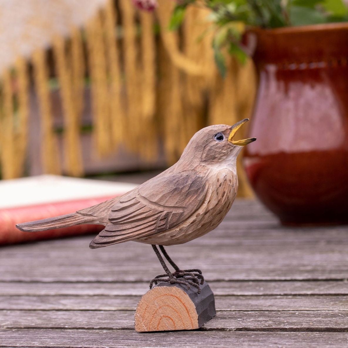 Näktrgalen är handskuren i lindträ och handmålad med vattenbaserad färg. Den är avbildad i en sjungande positur i naturlig storlek. Fågeln blir en vacker detalj i hemmet och en tidlös och unik present till alla som tycker om natur och djur.