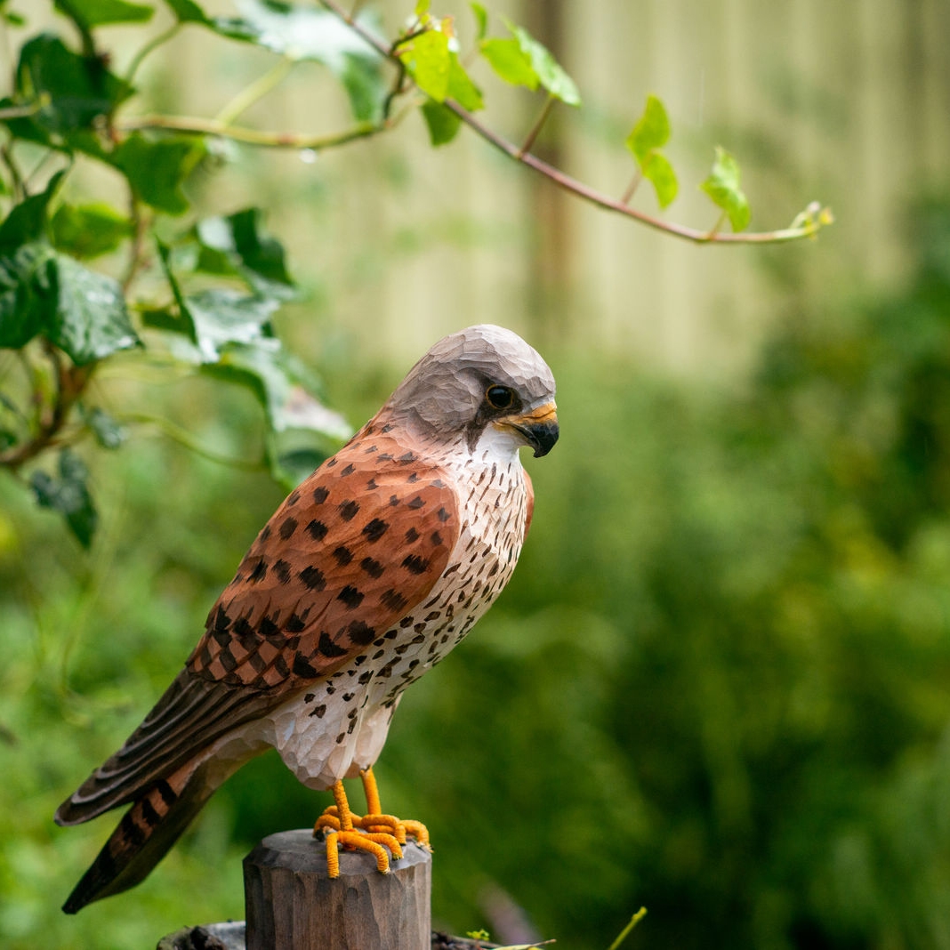 DecoBird Tornfalk är handskuren ur ett enda stycke lindträ och handmålad med vattenbaserad färg. Fågeln sitter på en träpåle och spanar uppmärksamt över omgivningen. Denna naturtrogna träfågel är en vacker och unik inredningsdetalj samt en uppskattad present till fågelintresserade.